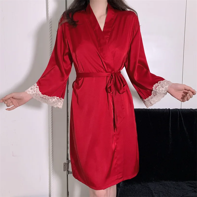 Female Sexy Black Twinset Robe Nightdress Set Lace Trim Sleepwear Kimono Bathrobe Nightgown Summer Rayon Home Dress Lounge Wear